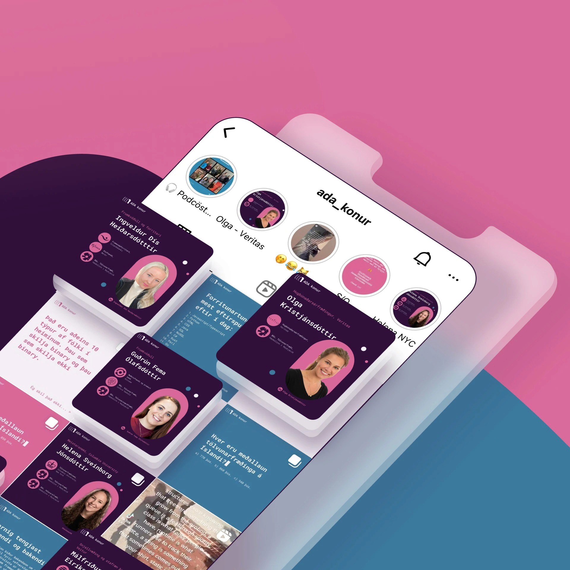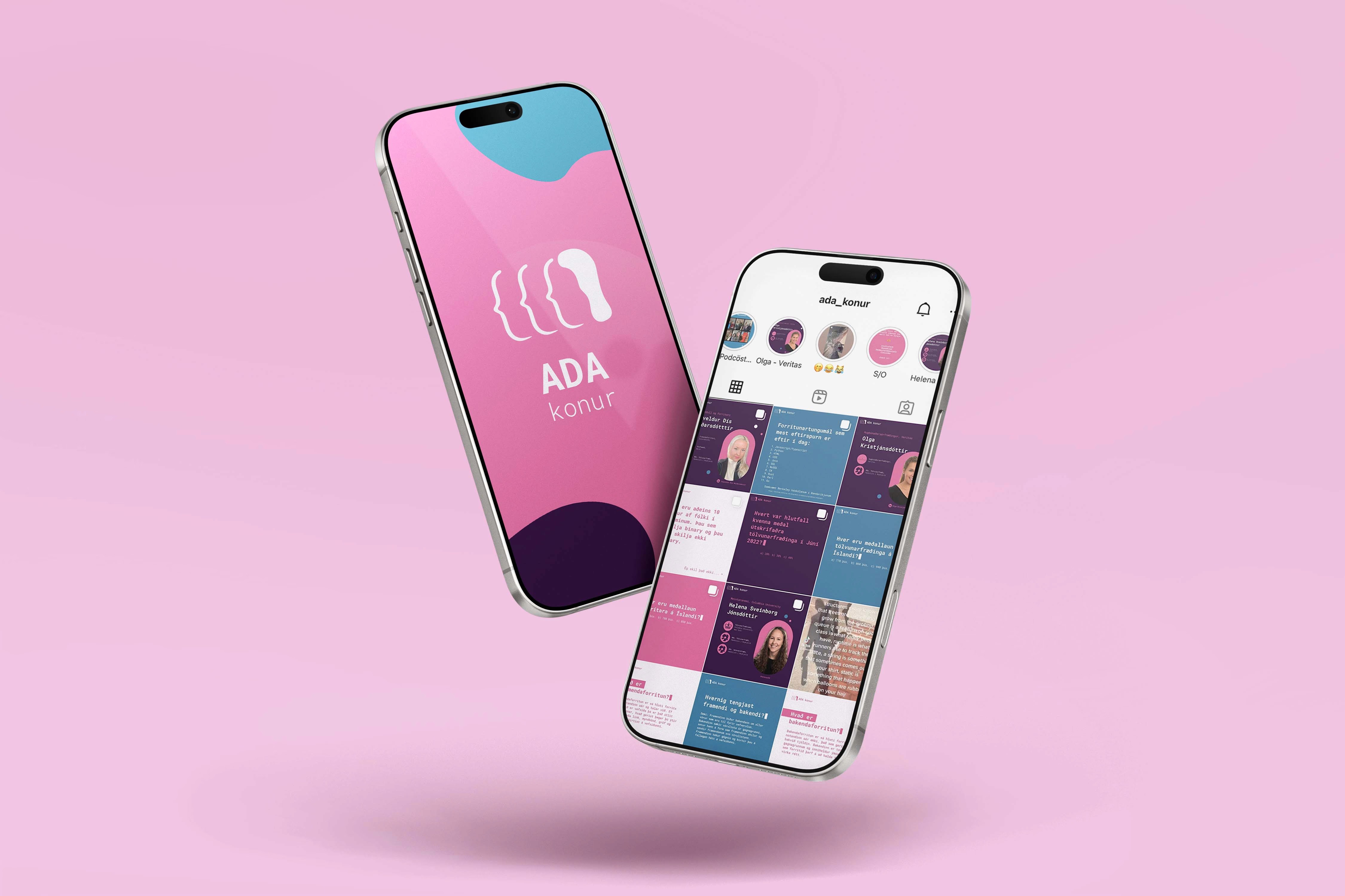 Ada konur er verkefni sem miðar að því að gera konur í tækni sýnilegri og skapa jákvæðar fyrirmyndir fyrir næstu kynslóð. Konur í hugbúnaði, hönnun og tæknistörfum deila sinni reynslu í gegnum Instagram og veita innsýn inn í hversdaginn. Það var mikilvægt að byggja upp vörumerki sem væri bæði faglegt og aðlaðandi fyrir breiðan hóp, en um leið auðvelt í notkun fyrir þá sem standa að verkefninu.