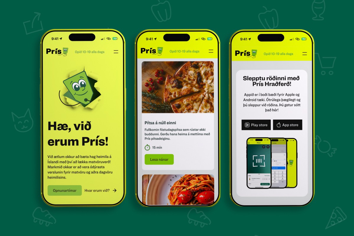 Hönnun og vörumerki: Við tókum vörumerki Prís (brand identity) og færðum það beint yfir á vefinn. Við innleiddum einkennislitina þeirra – þar sem neon-guli liturinn fær að njóta sín til fulls – og settum upp Ringside leturfjölskylduna sem gefur síðunni þetta einkennandi, þétta og hressa yfirbragð sem Prís stendur fyrir. Útkoman er "high-vis" hönnun sem grípur augað strax.